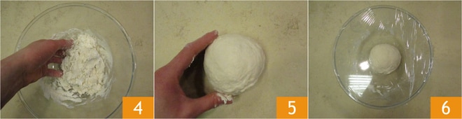 Pétrissez avec les mains 4. Déplacez-vous sur le plan de travail et formez une boule ronde 5, mettez-la dans le bol, couvrez avec du film alimentaire 6. Laissez lever pendant 1 heure à température ambiante ou dans un four éteint à 26°C, jusqu'à ce que la pâte double de volume.