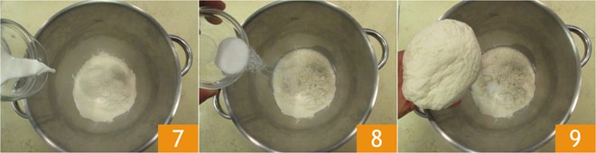 Versez dans le robot pâtissier avec le crochet la farine 00, le lait 7, le sucre 8 et la pâte précédemment mise à lever 9.