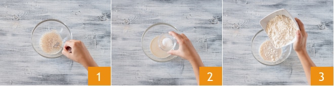 Tout d'abord, préparez le levain : dissolvez la levure sèche dans l'eau 1, ajoutez le sucre 2 et la farine en pluie 3.