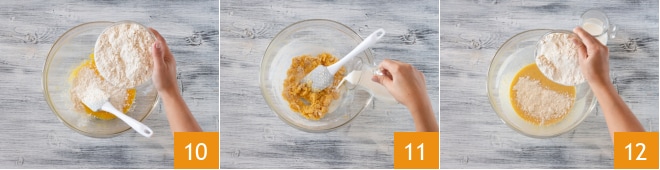 Ensuite, ajoutez un peu de farine 10 et un peu de lait, en les alternant entre eux 12 et en pétrissant jusqu'à obtenir une pâte douce et homogène.