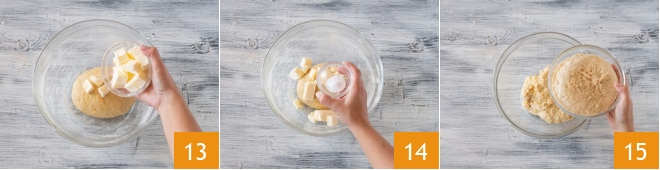 Ajoutez également le beurre mou coupé en morceaux 13. Puis versez le sel 14 et pétrissez avec les mains jusqu'à obtenir une pâte homogène. Ajoutez maintenant le levain préparé précédemment 15