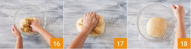 et pétrissez avec les mains 16. Lorsque vous aurez obtenu une pâte homogène, transférez le tout sur une planche farinée 17. Pétrissez encore jusqu'à former une boule douce, puis transférez-la à nouveau dans le bol, couvrez avec un film plastique 18 et laissez lever environ 3 heures, toujours dans le four éteint avec la lumière allumée.