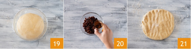 Lorsque la pâte a doublé de volume 19, versez les raisins secs dans un bol et ajoutez le rhum 20. Laissez-les s'attendrir et, en attendant, transférez la pâte sur un plan légèrement fariné 21