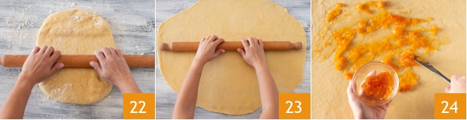 Étalez la pâte avec un rouleau à pâtisserie 22, obtenant une épaisseur mince d'environ 3 ou 4 mm, formant un rectangle 23. Badigeonnez toute la surface avec la confiture 24
