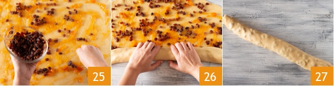 et ajoutez les raisins bien essorés 25. Ensuite, enroulez fermement en partant du côté le plus long 26. Au bout, vous obtiendrez un boudin 27