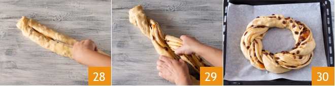 Avec un couteau fariné à lame lisse et large, faites une incision à partir de 3-4 cm du début et continuez sur toute la longueur 28. À ce stade, entrelacez les deux moitiés 29, en scellant bien les deux extrémités. Transférez très délicatement sur une plaque recouverte de papier sulfurisé et joignez les deux extrémités pour créer une couronne 30. Laissez la couronne lever encore environ 20 minutes dans un endroit chaud, dans le four éteint avec la lumière allumée.