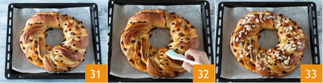 Faites cuire dans un four statique à 180°C pendant environ 30 minutes. Sortez du four 31 et laissez tiédir, puis badigeonnez de miel 32 et décorez avec des amandes effilées 33.