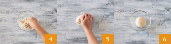 Mélangez bien, d'abord avec une cuillère en bois puis avec les mains jusqu'à former une pâte homogène 4. Transférez-la sur un plan et travaillez quelques minutes 5, et lorsqu'elle sera lisse et homogène, formez une boule et déposez-la dans un bol 6.