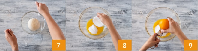 Couvrez avec un film plastique 7 et laissez lever 30 minutes dans le four éteint avec la lumière allumée. Dès que le levain a doublé de volume, commencez à préparer la pâte. Mettez les jaunes d'œuf dans un grand bol, ajoutez le sucre 8, le zeste râpé de l'orange 9 et mélangez.