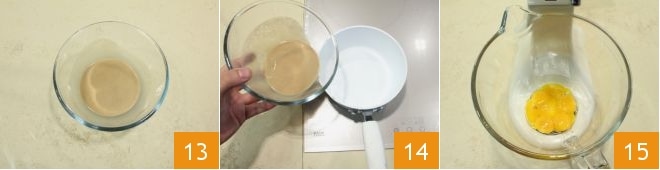 Prenez le lait que vous avez obtenu 13 et faites-le chauffer à nouveau 14. Dans le bol d'un robot pâtissier équipé de fouets, placez les jaunes d'œufs 15