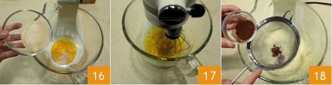 avec le sucre de canne 16. Travaillez le tout avec les fouets 17, puis ajoutez le cacao tamisé 18
