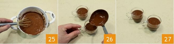 Lorsque la crème a épaissi 25, éteignez le feu et avec l'aide d'une louche, versez-la dans les verrines 26 : dégustez votre crème de café bien chaude immédiatement 27.