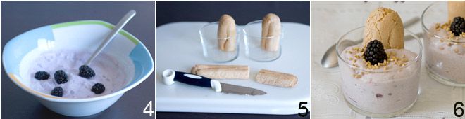Ajoutez les mûres lavées et entières 4 (réservez-en 4 pour la décoration). À l'aide d'une fourchette, écrasez-les légèrement pour en faire sortir le jus, en laissant aussi quelques petits morceaux entiers. Coupez des biscuits à la cuillère pour les faire tenir debout dans un verre 5. Remplissez les verres avec la crème de fromage. Décorez les verres avec les mûres que vous avez mises de côté et avec les éclats de fruits secs 6.