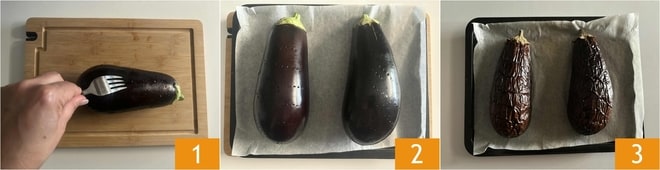 Pour préparer la crème d'aubergines, lavez-les, posez-les sur une planche à découper et percez-les avec une fourchette 1; cette étape est essentielle pour éviter qu'elles n'explosent pendant la cuisson. Une fois préparées toutes les deux, transférez-les sur une plaque recouverte de papier sulfurisé 2, sans rien ajouter. Mettez au four à 200° en mode statique pendant environ 45 minutes, au milieu du four 4.