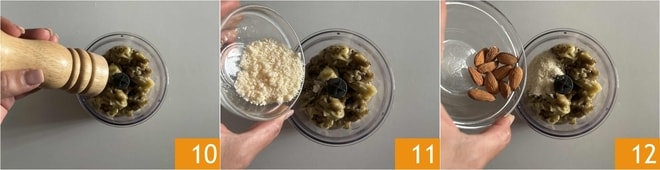 À ce stade, ajoutez une pincée de sel, une pincée de poivre 10, le parmesan râpé 11 et les amandes 12.
