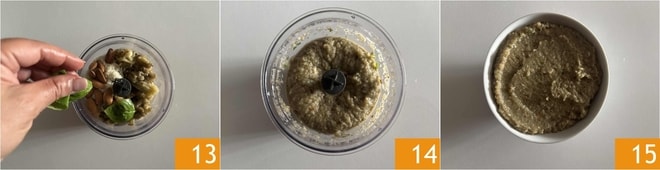 Ajoutez ensuite le basilic 13, puis refermez le mixer et mixez le tout jusqu'à obtenir une crème homogène 14. Transférez dans un petit bol 15.
