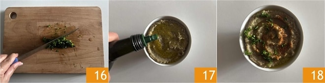 Prenez ensuite le persil et hachez-le finement 16. Enrichissez la crème d'aubergines avec un filet d'huile 17, le persil finement haché et une pincée de piment 18! Servez-la immédiatement ou conservez-la au réfrigérateur!
