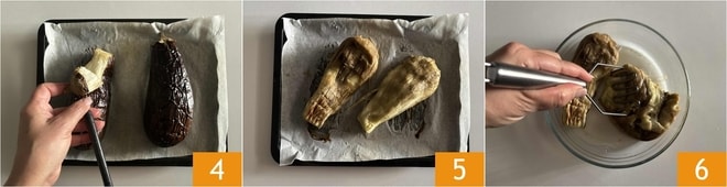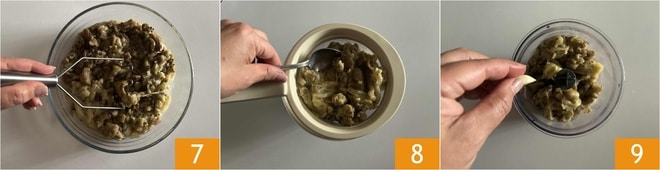 Puis écrasez-les légèrement 7 avec l'ustensile approprié ou avec une fourchette. Transférez la pulpe des aubergines dans une passoire au-dessus d'un bol, pressez légèrement avec une cuillère pour faire sortir l'excès d'eau de végétation 8. Transférez ensuite dans un mixer et ajoutez la gousse d'ail épluchée 9.