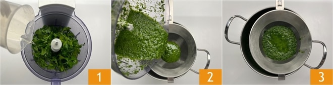 Pour préparer la crème de topinambour avec noix de Saint-Jacques poêlées, commencez par l'huile verte : mettez le persil dans un mixeur, puis ajoutez l'huile de graines 1 et mixez pendant 5 minutes. Filtrez la crème obtenue avec une passoire fine 2 et placez-la au-dessus d'un bol pour récupérer le liquide. Mettez la passoire et le bol au réfrigérateur et laissez filtrer pendant 4 heures 3.