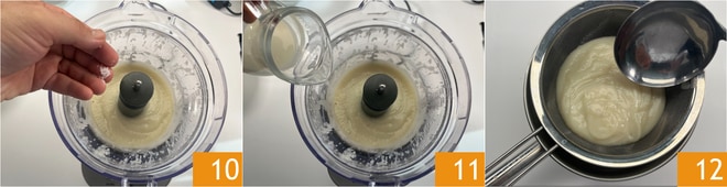 Transférez maintenant la pulpe de topinambour dans le mixeur et mixez à haute vitesse pendant 3 minutes. Salez 10, ajoutez le lait d'amande 11 et mixez à nouveau pendant au moins 5 minutes, jusqu'à obtenir une crème lisse. Tamisez la crème à travers une passoire 12.