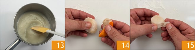 Rassemblez la crème de topinambour dans une petite casserole 13, afin de pouvoir la réchauffer juste avant de servir. Enfin préparez les noix de Saint-Jacques : enlevez le corail 14 et la partie la plus dure 15, puis transférez-les sur du papier absorbant pour les sécher.