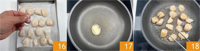 Salez les noix de Saint-Jacques des deux côtés 16. Dans une poêle antiadhésive, faites fondre le beurre 17, puis placez les noix de Saint-Jacques et poêlez-les pendant 2 minutes de chaque côté 18.