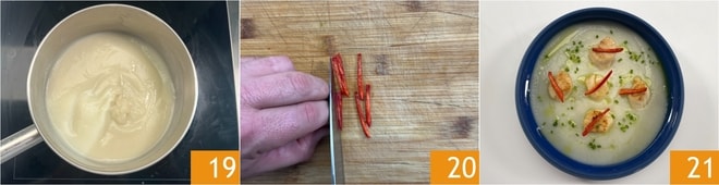 Réchauffez la crème de topinambour 19. Pendant ce temps, coupez les piments en deux dans le sens de la longueur et retirez les graines, puis coupez-les en julienne 20. Vous êtes prêts à dresser : répartissez une louche de crème de topinambour au fond, puis ajoutez 5 noix de Saint-Jacques par assiette et garnissez de ciboulette finement hachée et de piment. Complétez avec quelques gouttes d'huile au persil et votre crème de topinambour avec noix de Saint-Jacques poêlées est prête à être servie 21 !