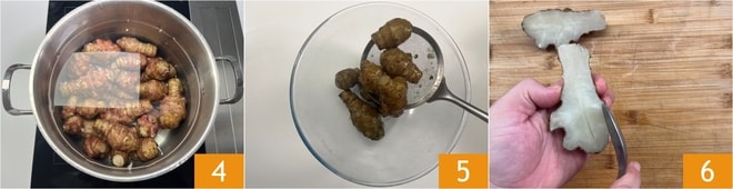 Passez au topinambour : mettez le topinambour dans une casserole et couvrez d'eau abondante 4, puis faites cuire pendant 3 heures, jusqu'à ce que la partie centrale soit également tendre. Éteignez le feu et laissez tiédir dans leur eau, ensuite égouttez les tubercules 5 et coupez-les en deux 6.