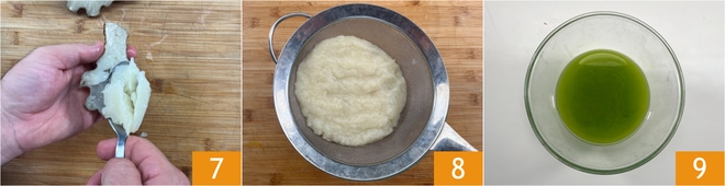 Prélevez la pulpe avec une cuillère 7 et mettez-la dans une passoire pour éliminer l'excès d'eau 8. Pendant ce temps, sortez l'huile verte du réfrigérateur et ramenez-la à température ambiante 9.