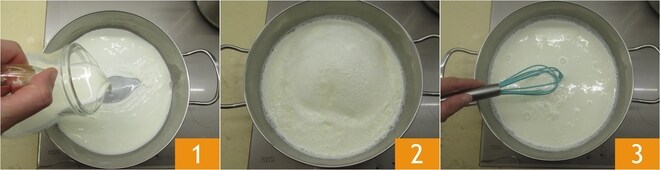Pour préparer la crème à cuire, versez le lait dans une grande casserole 1. Allumez le feu et portez à ébullition 2. Dès qu'il commencera à bouillir, mélangez avec un fouet 3.