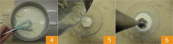 Faites cuire pendant environ 20 minutes au total à feu moyen-élevé, en mélangeant de temps en temps. Ne vous inquiétez pas des grumeaux qui se formeront 4. Laissez réduire le lait jusqu'à ce qu'il commence à épaissir et prenne une couleur ivoire. Votre crème sera prête lorsqu'en la pesant, elle fera 150 g, alors elle aura suffisamment réduit. Transférez-la dans un bol 5 et mixez-la avec un mixeur plongeant 6 jusqu'à ce qu'elle soit lisse.