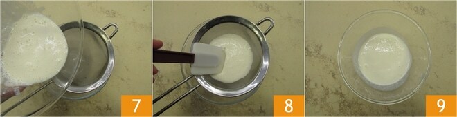 Versez-la dans une passoire que vous aurez placée sur un bol 7 et filtrez-la. Aidez-vous avec une spatule 8. La crème à cuire maison est prête 9, utilisez-la immédiatement ou couvrez-la de film plastique et conservez-la au réfrigérateur jusqu'à utilisation.