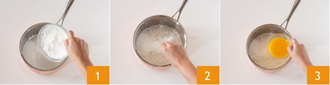 Pour préparer la crème à la pistache, dans une casserole versez le sucre, la maïzena 1, le sel (facultatif) 2 et les jaunes d'œufs 3.