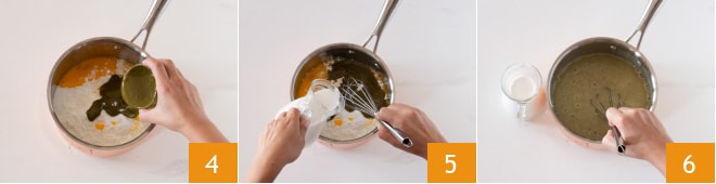 Poursuivez en ajoutant la pâte de pistaches 4 et un peu de lait à température ambiante. Mélangez énergiquement avec un fouet, jusqu'à obtenir un mélange lisse 6. Ajoutez ensuite le lait restant