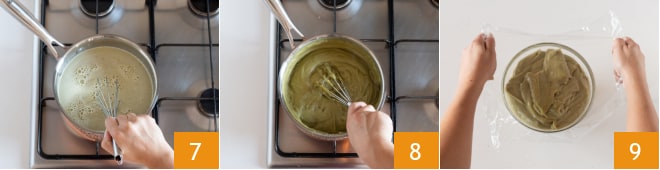 et transférez le mélange sur le feu 7. Mélangez continuellement pendant quelques minutes jusqu'à ce que la crème épaississe 8. À ce stade, transférez la crème dans un bol, couvrez avec du film alimentaire au contact 9 et laissez refroidir.