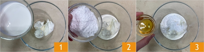 Pour préparer la crème au mascarpone sans œufs, versez dans un bol le mascarpone et la crème 1, puis ajoutez le sucre glace 2 et le Grand Marnier 3.