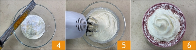 Ajoutez également le zeste d’orange râpé 4 et travaillez avec un batteur électrique à vitesse moyenne, jusqu'à obtenir une consistance lisse et ferme 5. Votre crème au mascarpone sans œufs est prête à être servie 6 !