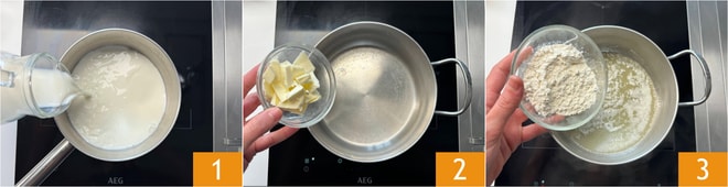 Pour préparer la crème au Parmesan, commencez par faire chauffer le lait dans une petite casserole 1, sans le laisser bouillir. Dans une autre casserole, mettez le beurre 2 et faites-le fondre à feu doux. Ajoutez la farine en pluie 3.