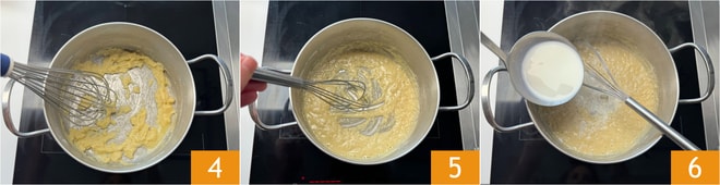 Mélangez avec un fouet 4 jusqu'à ce que le roux soit bien amalgamé et de couleur dorée 5. Versez le lait chaud peu à peu 6 en mélangeant continuellement avec le fouet pour éviter la formation de grumeaux. Faites cuire à feu doux jusqu'à épaississement du mélange.