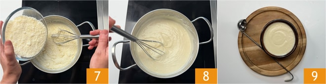 Éteignez le feu et ajoutez le Parmesan râpé 7, progressivement, en mélangeant continuellement avec le fouet. Vous devez obtenir une consistance assez épaisse 8, si vous prélevez une cuillère de crème et la laissez tomber dans la casserole, elle doit rester quelques instants à la surface avant de s'incorporer, alors la consistance sera correcte. Votre crème au Parmesan est prête à être utilisée pour vos préparations 9.