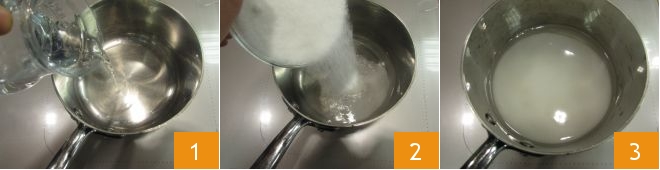 Pour préparer le flan de vanille, commencez par le caramel. Versez l'eau dans une casserole 1, ajoutez le sucre 2 et portez le sirop 3 à ébullition à feu doux.