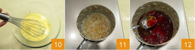 et fouettez le tout 10. Entre-temps, le sirop aura commencé à bouillir 11, attendez qu'il atteigne une couleur ambrée foncée, puis éteignez le feu et, pour arrêter la cuisson du sucre, immergez la base de la casserole dans un bol rempli d'eau en faisant attention à ne pas mettre l'eau en contact avec le caramel. À ce stade, à l'aide d'une cuillère 12, répartissez le caramel dans 4 petites cocottes en céramique de 7 cm de diamètre et 5 cm de hauteur.