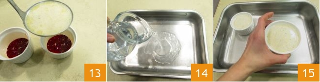 À l'aide d'une louche 13, répartissez de manière égale le mélange dans les 4 cocottes, en laissant au moins 1 cm du bord. À ce stade, passez à la cuisson au bain-marie. Munissez-vous d'un plat suffisamment grand et aux bords hauts, remplissez-le d'eau chaude 14 et placez les cocottes à l'intérieur 15. Faites cuire dans un four statique préchauffé à 160° pendant environ 50 minutes, sur l'étagère la plus basse.