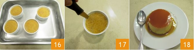 À la fin du temps de cuisson, sortez les flans de vanille du four 16 et laissez-les refroidir d'abord à température ambiante puis au réfrigérateur pendant au moins 3 heures. Au moment de les servir, plongez la cocotte dans une casserole remplie d'eau bouillante (sans la mettre en contact avec le flan) et, avec un couteau à lame lisse, faites une incision tout autour de la circonférence 17. De cette façon, il sera plus facile d'extraire le flan et de le retourner sur une assiette à dessert 18.