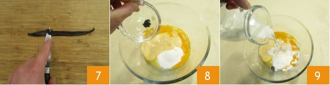Prélevez les graines de la gousse de vanille 7 et ajoutez-les au mélange 8. Enfin, versez le lait 9