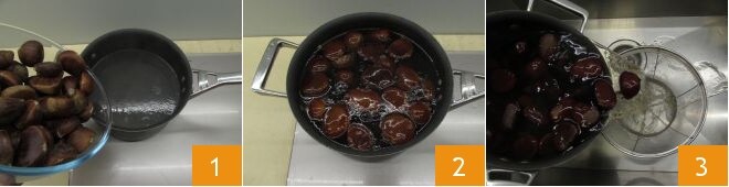 Pour préparer la crème de poireaux et châtaignes, commencez par ces dernières. Lavez-les, séchez-les puis versez-les dans une casserole remplie d'eau froide 1, portez à ébullition 2. Faites-les cuire pendant 10 minutes puis égouttez-les 3.