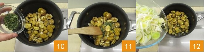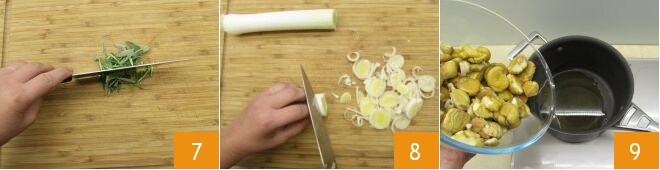 Puis hachez les feuilles de romarin et de sauge 7 et mettez-les dans un bol; nettoyez le poireau en éliminant les deux extrémités et les feuilles les plus externes, enfin tranchez-le finement 8. Passez aux fourneaux. Mettez sur le feu une grande casserole et versez un filet d'huile. Dès qu'elle est chaude, plongez les châtaignes 9.