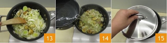 mélangez à nouveau 13 et faites cuire pendant encore 6-7 minutes, ainsi le poireau va bien s'adoucir. Pendant ce temps, versez de l'eau dans une casserole et chauffez-la. Puis versez-la sur le mélange 14, couvrez avec le couvercle et laissez cuire à feu doux pendant environ 40 minutes 15.