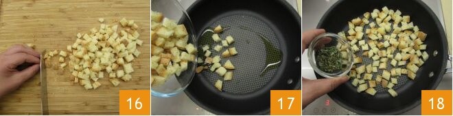 Pendant ce temps, occupez-vous du pain, coupez-le en cubes d'environ 1 cm avec un couteau à dentelure 16 et faites-le dorer dans une poêle déjà chaude avec un peu d'huile 17, assaisonnez avec le reste du hachis aromatique 18,