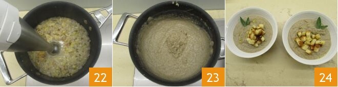 mixez-le alors qu'il est encore bien chaud 22 : ajustez la consistance en ajoutant encore un peu d'eau si nécessaire 23. Versez la crème de poireaux et châtaignes dans les assiettes, garnissez avec les cubes de pain, quelques feuilles de sauge et un filet d'huile à cru et bon appétit 24 !